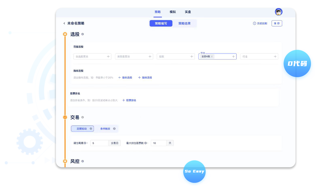 針對“入門投資者”客群,因其缺少選股投資技能或僅具備投資選股操作基礎,在面對超過4000只股票及相關標的, 以及海量、龐雜的市場數據和資訊時,對標的篩選仍難以入手的痛點,輕量化策略工具基于客觀財務和行情數據、具備快速回測歷史數據、操作簡單的策略選股,滿足該用戶群體的需求。