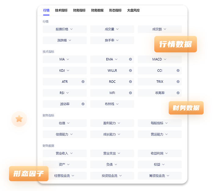 支持全行情數據、財務數據、形態(tài)因子等多因子;